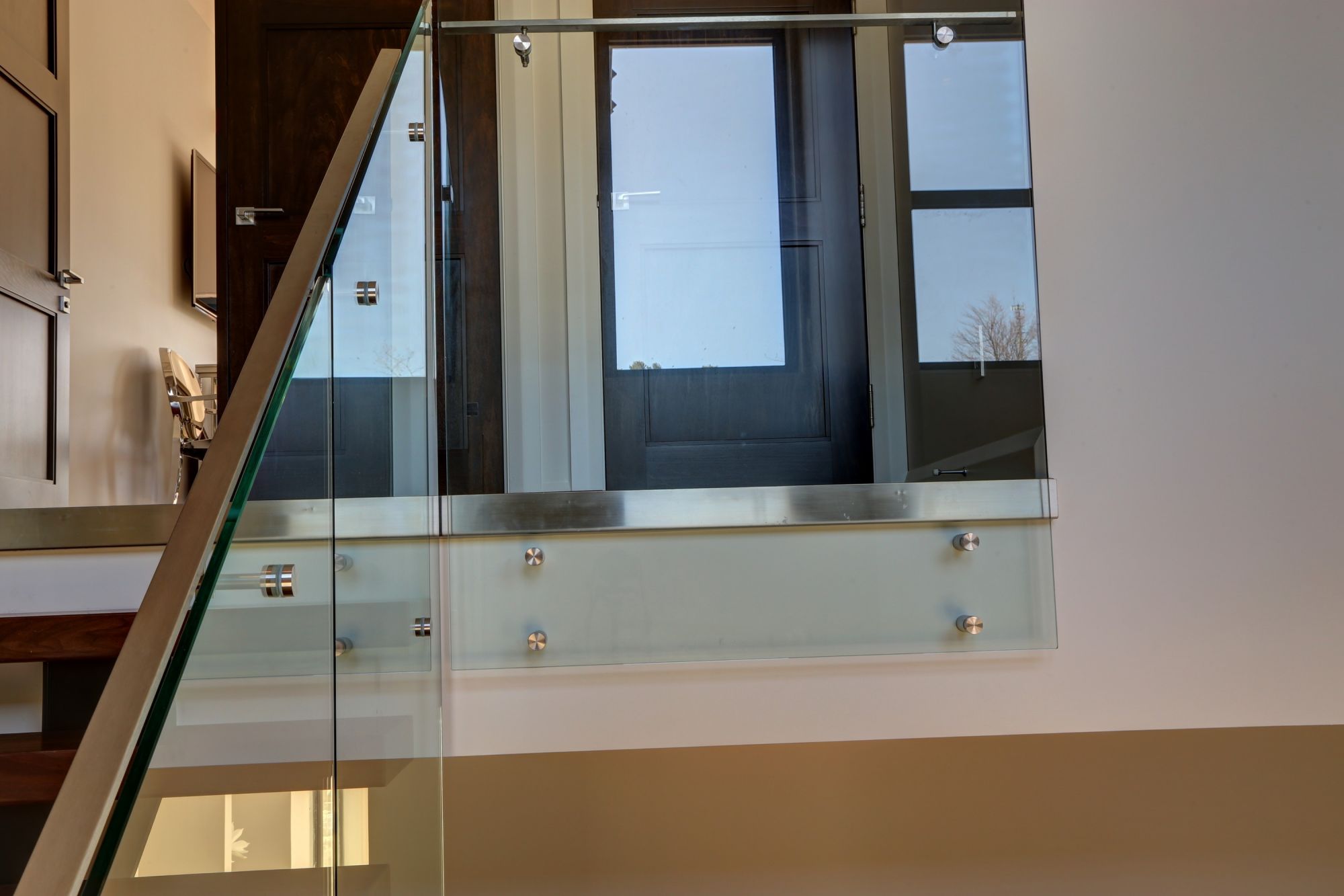 Steel staircase wood steps glass pannels stainless steel nosing